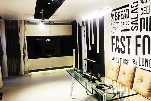 A cozy party corner featuring a 65″ UHD LED TV — perfect for movie nights or relaxing after a busy day.