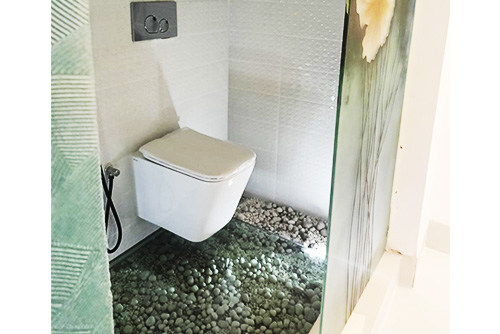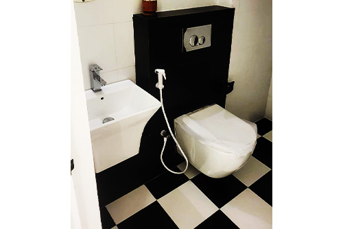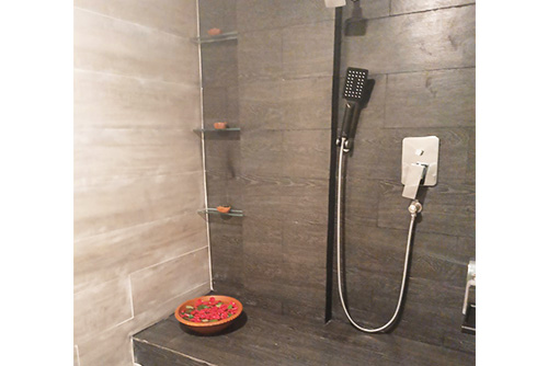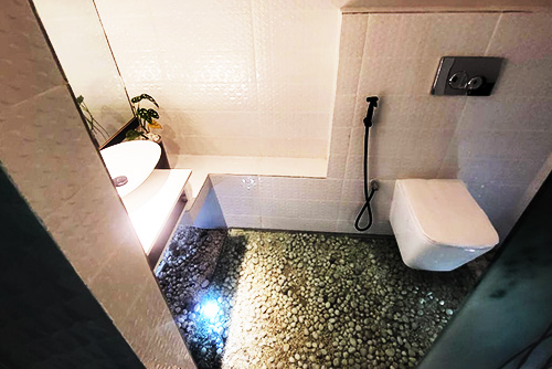 A private shower area with an attached English toilet, plus an additional common toilet for guests.